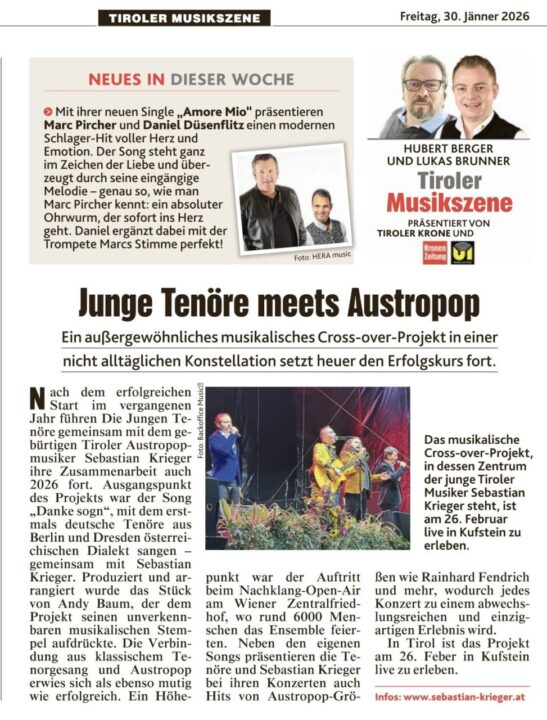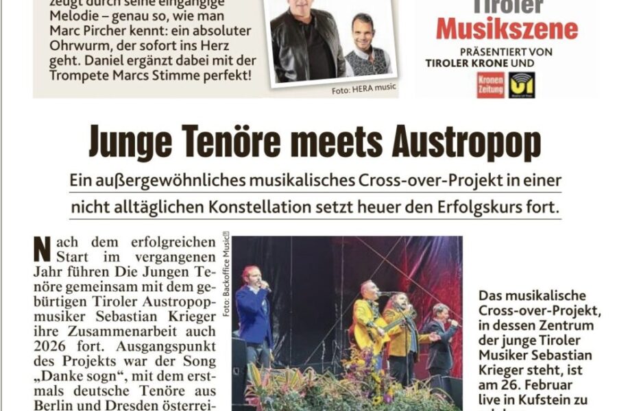 Ein musikalisches Experiment, das es in dieser Form noch nie gegeben hat: Die Jungen Tenöre, seit über 28 Jahren bekannt für ihre beeindruckenden Stimmen, schlagen eine neue Richtung ein und widmen sich dem Austropop. Damit geht für das renommierte Gesangstrio ein langgehegter Traum in Erfüllung: „Wir lieben den Austropop und freuen uns riesig, diese Musikrichtung nun aktiv mitgestalten zu dürfen – und das GEMEINSAM mit SEBASTIAN KRIEGER